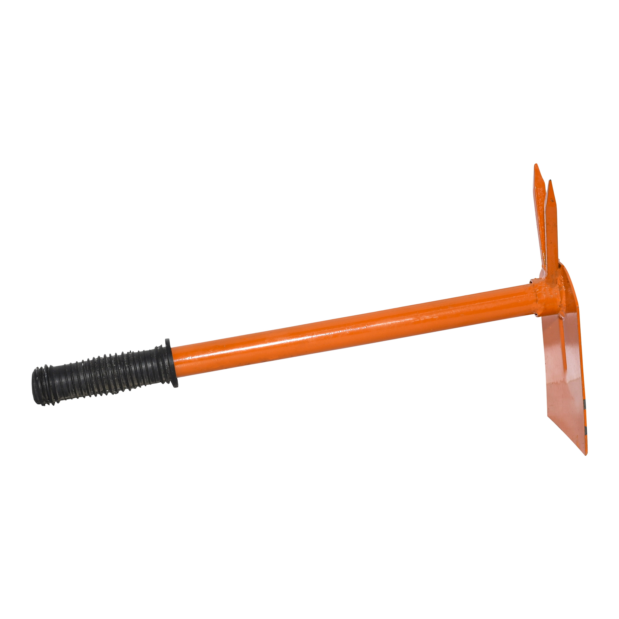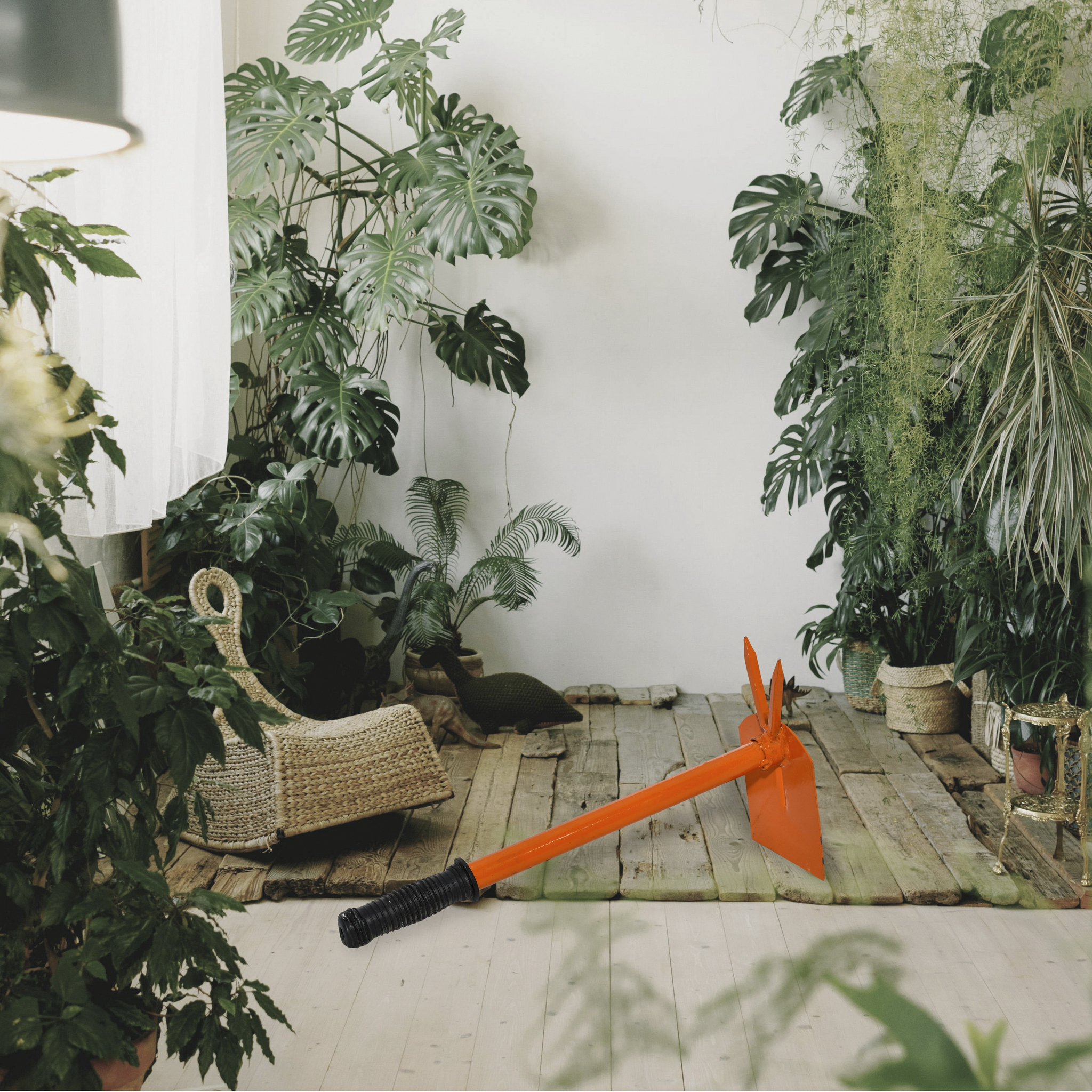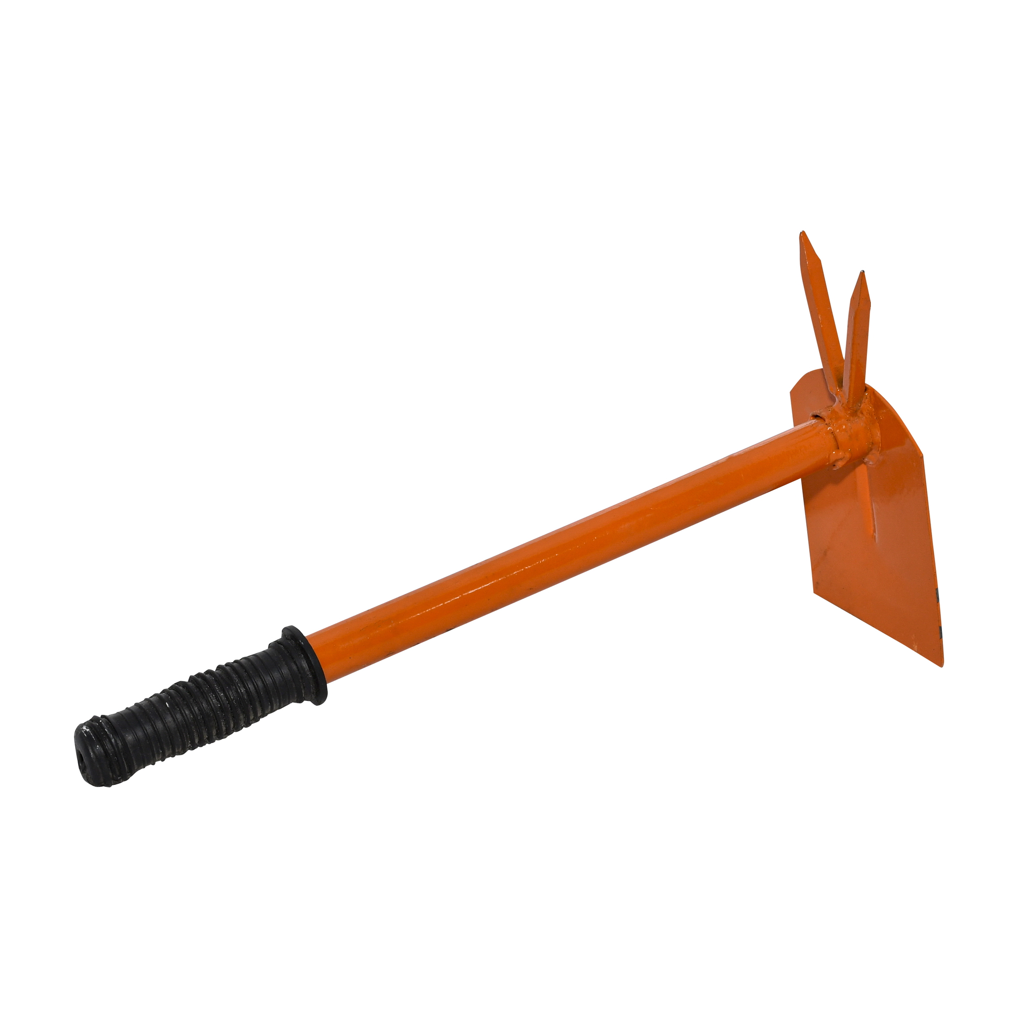A versatile and highly efficient 2-in-1 hand tool, designed to handle multiple gardening tasks with ease. This tool features a heavy-duty steel head that combines two essential functions: one side is a sharp hoe blade for chopping, weeding, and shaping soil, while the other side has two powerful cultivator tines for breaking up hard ground and aerating. The sturdy steel handle is finished in bright orange for high visibility and is equipped with a comfortable, non-slip rubber grip for superior control and reduced fatigue. This combination tool is a must-have for any gardener, saving both time and space in the tool shed.
