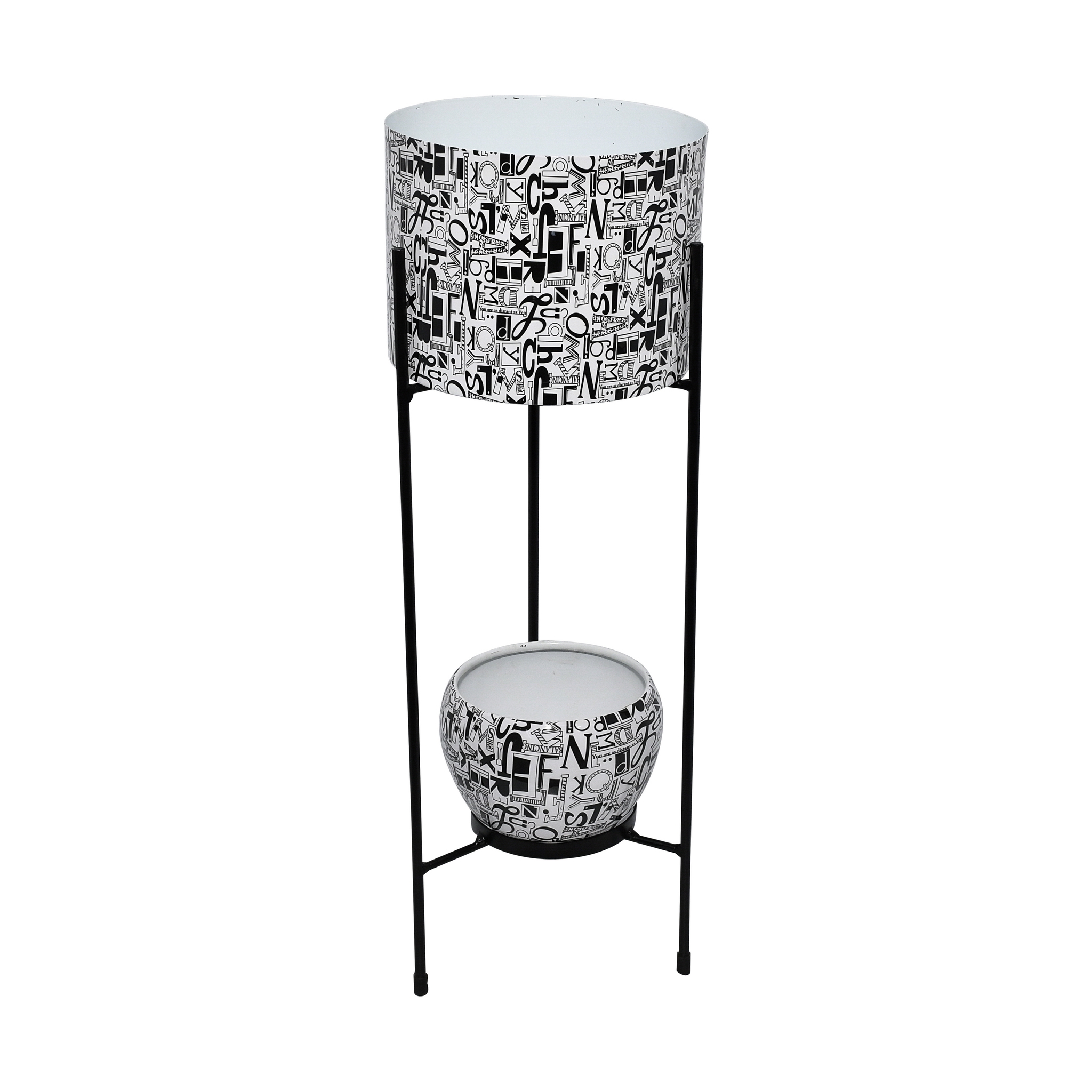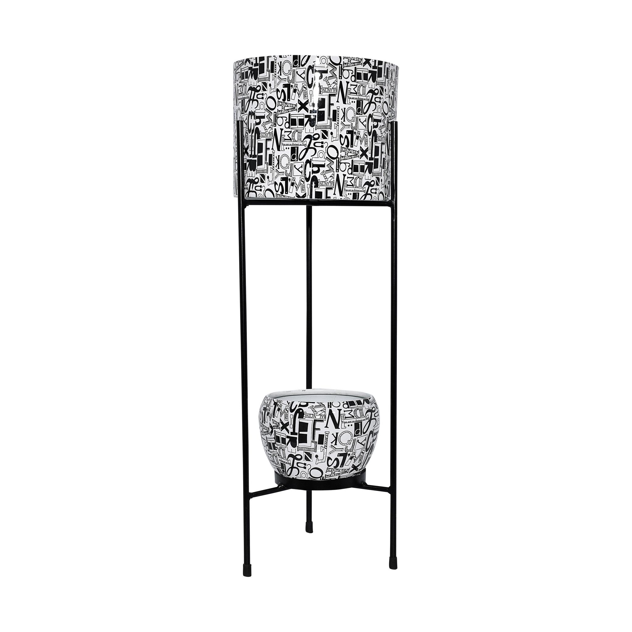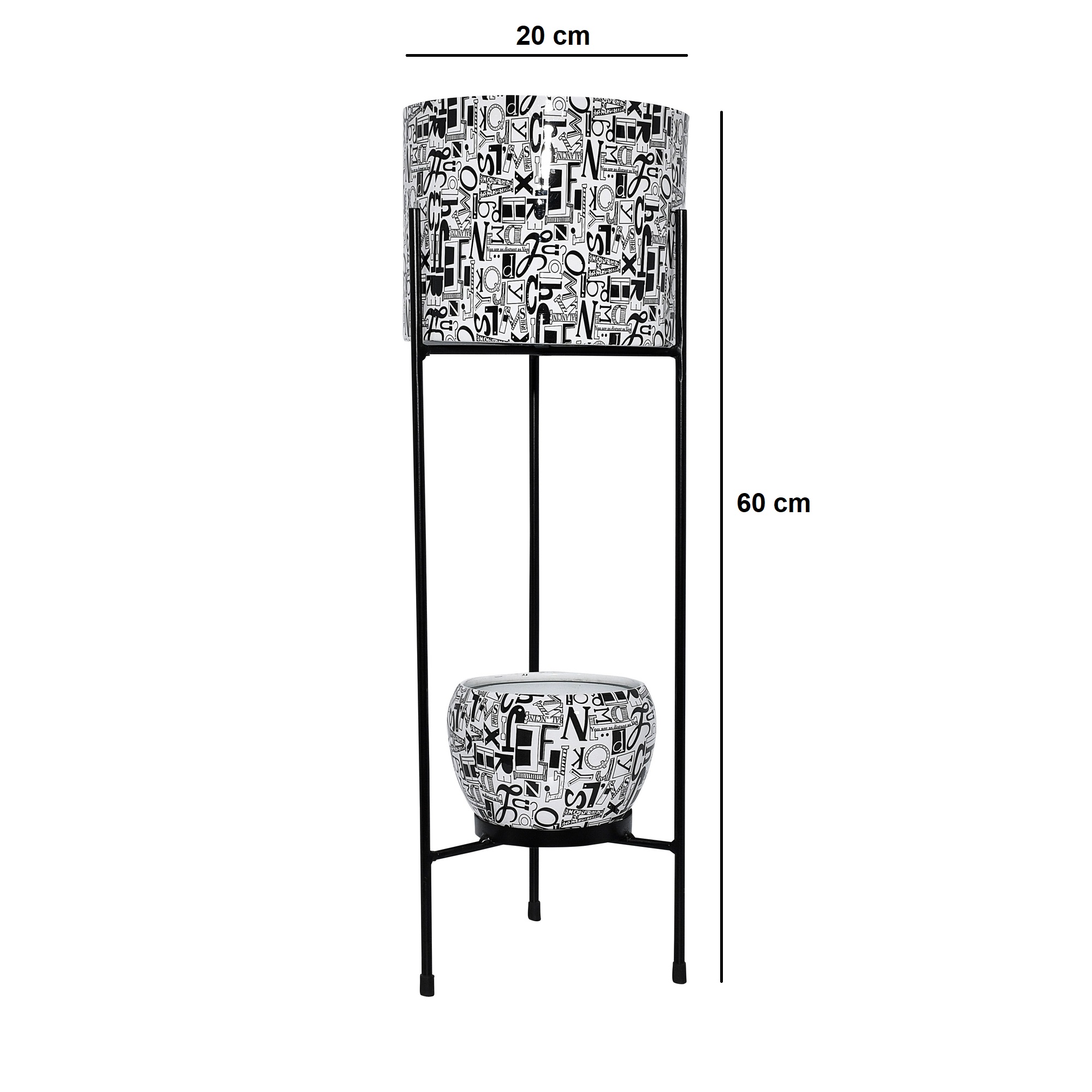 Enhance your home or garden décor with this Iron Two-Pot Planter with Stand, featuring a charming floral design in pastel green. Crafted from durable iron, this set includes two pots – one large cylindrical pot and one round pot – both with a diameter of 20 cm. The total height of the stand is 60 cm, making it perfect for displaying real or artificial plants. Its elegant floral print and sturdy black frame add a touch of sophistication to living rooms, balconies, patios, or event spaces.