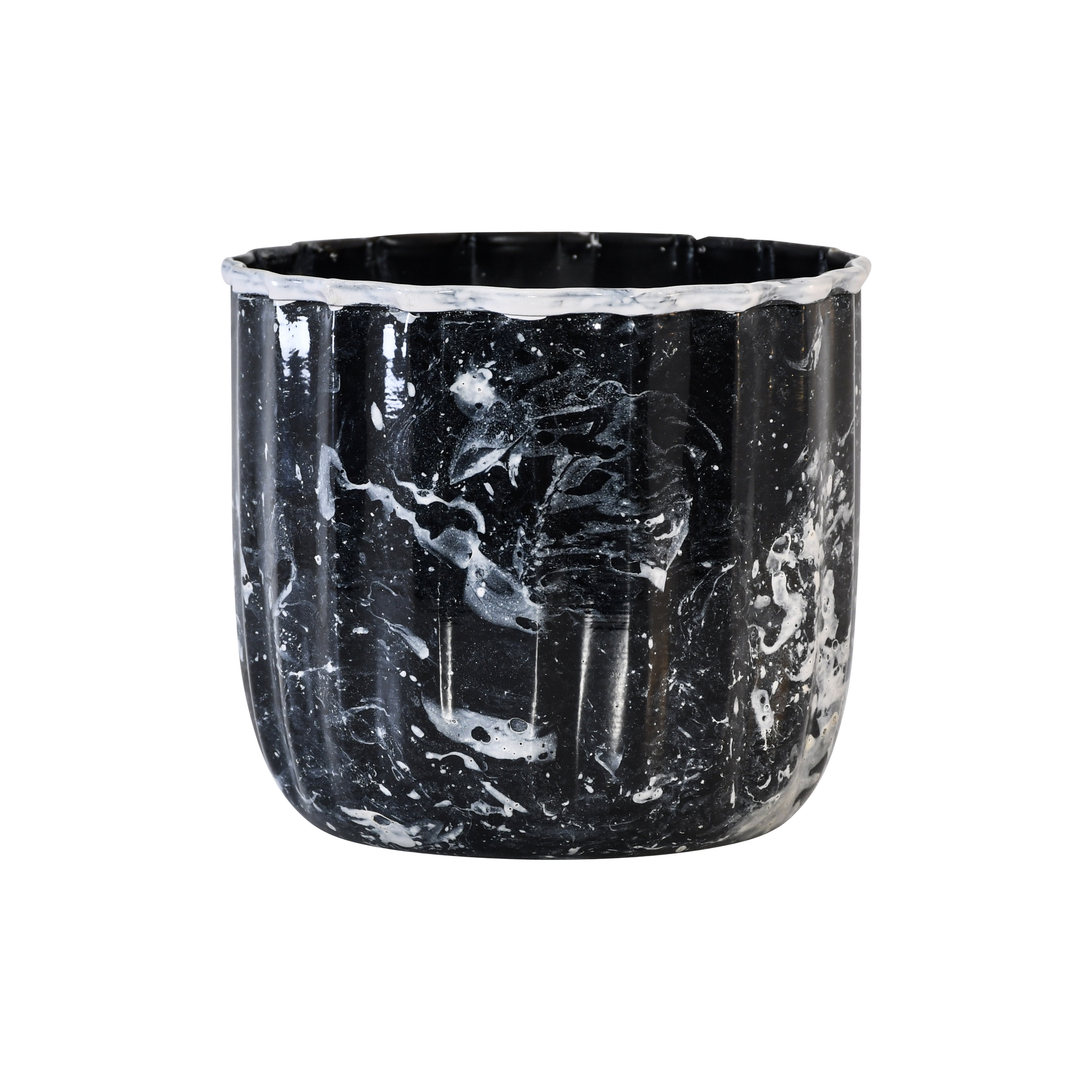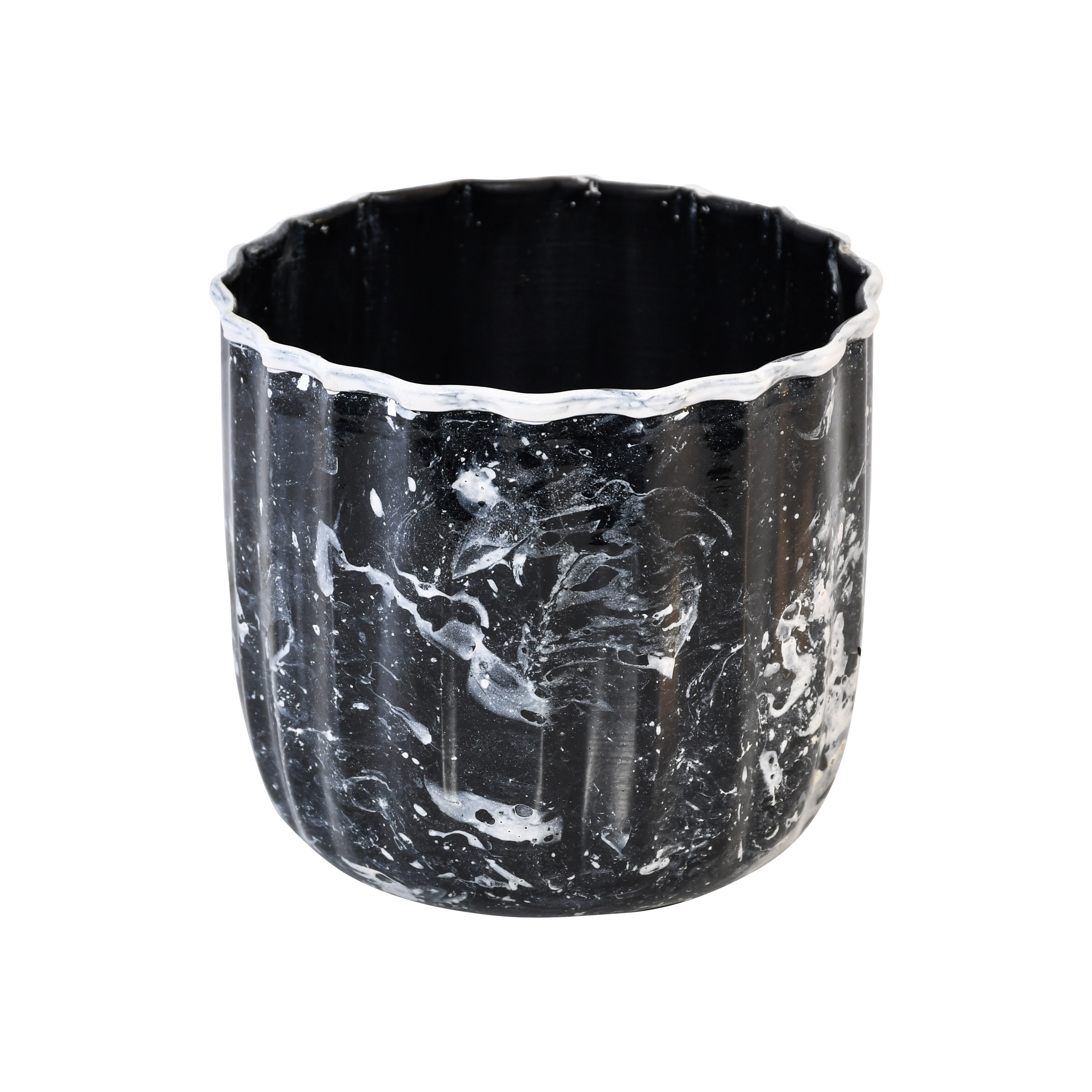 A dramatic and artistic piece, this metal planter makes a bold statement with its unique texture and finish. The planter’s body features a distinct vertical fluting that creates a ribbed, tactile surface. This is overlaid with a striking black marble effect, characterized by dynamic swirls and splashes of white over a dark background. The planter’s wavy, scalloped rim is further emphasized by a thick, contrasting white painted edge, adding to its handcrafted, rustic charm. This vessel is perfect for housing a favorite plant or as a standalone decorative object, bringing a touch of sophisticated drama to any space.