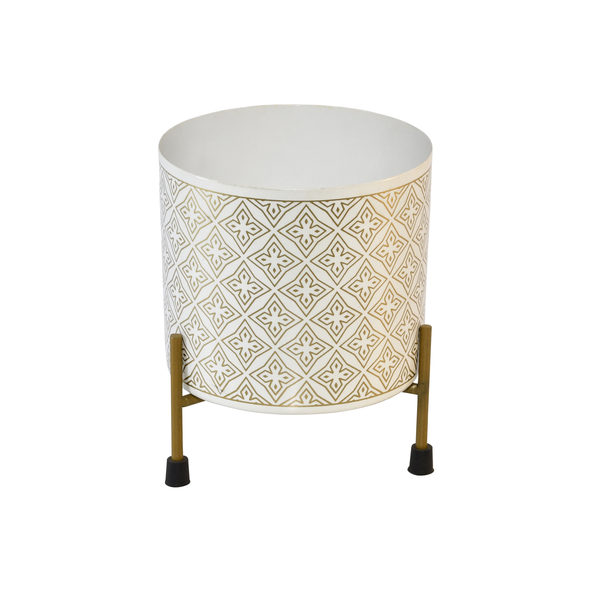 A sophisticated planter set that blends modern form with classic elegance. The cylindrical pot is crafted from durable metal and features a glossy white, subtly marbled background. This provides a stunning canvas for the intricate, repeating geometric pattern finished in a brilliant metallic gold. The design, reminiscent of classic tilework, adds a touch of luxury and visual texture. The pot is perfectly supported by a minimalist, four-legged metal stand in a complementary matte gold finish, complete with protective caps on its feet. This stylish duo is ideal for showcasing houseplants and adding a glamorous accent to any living space or office.