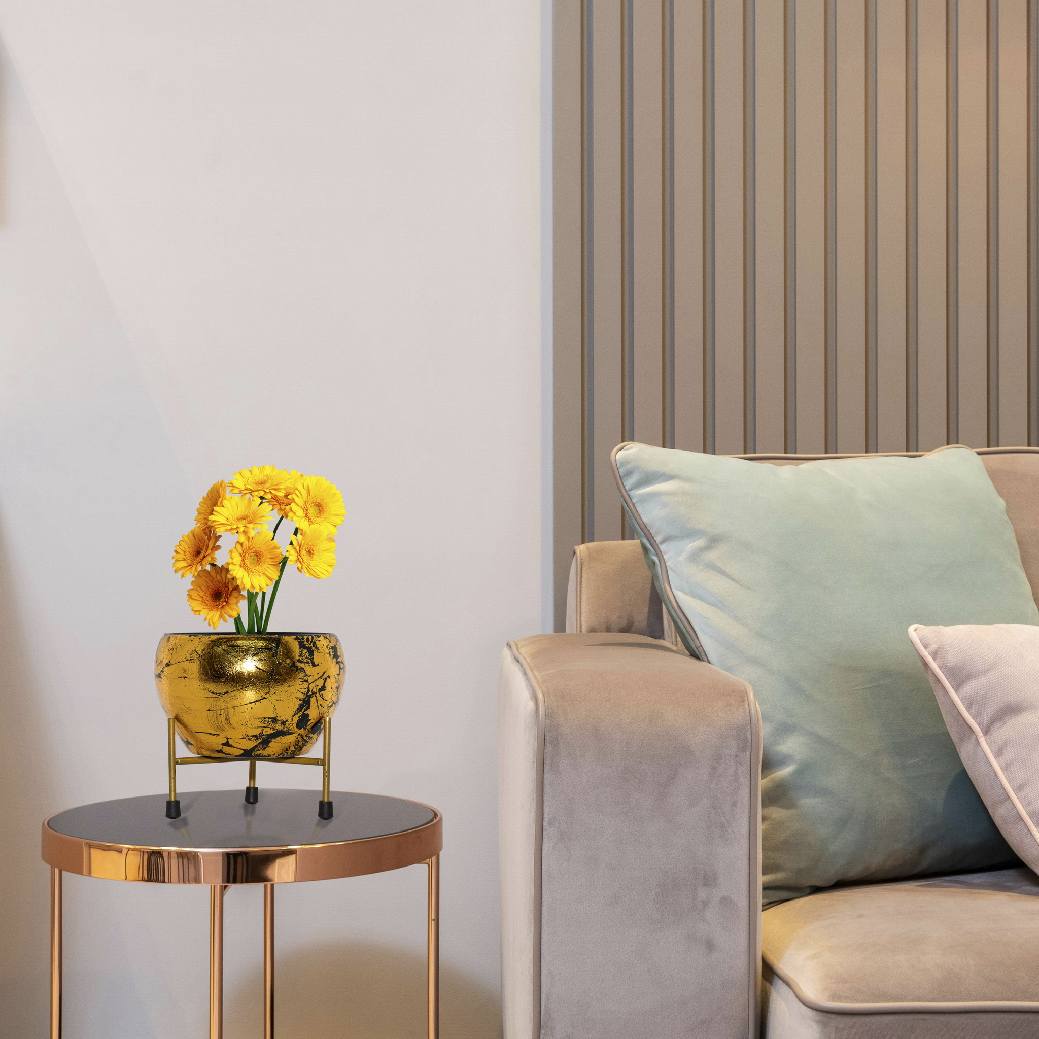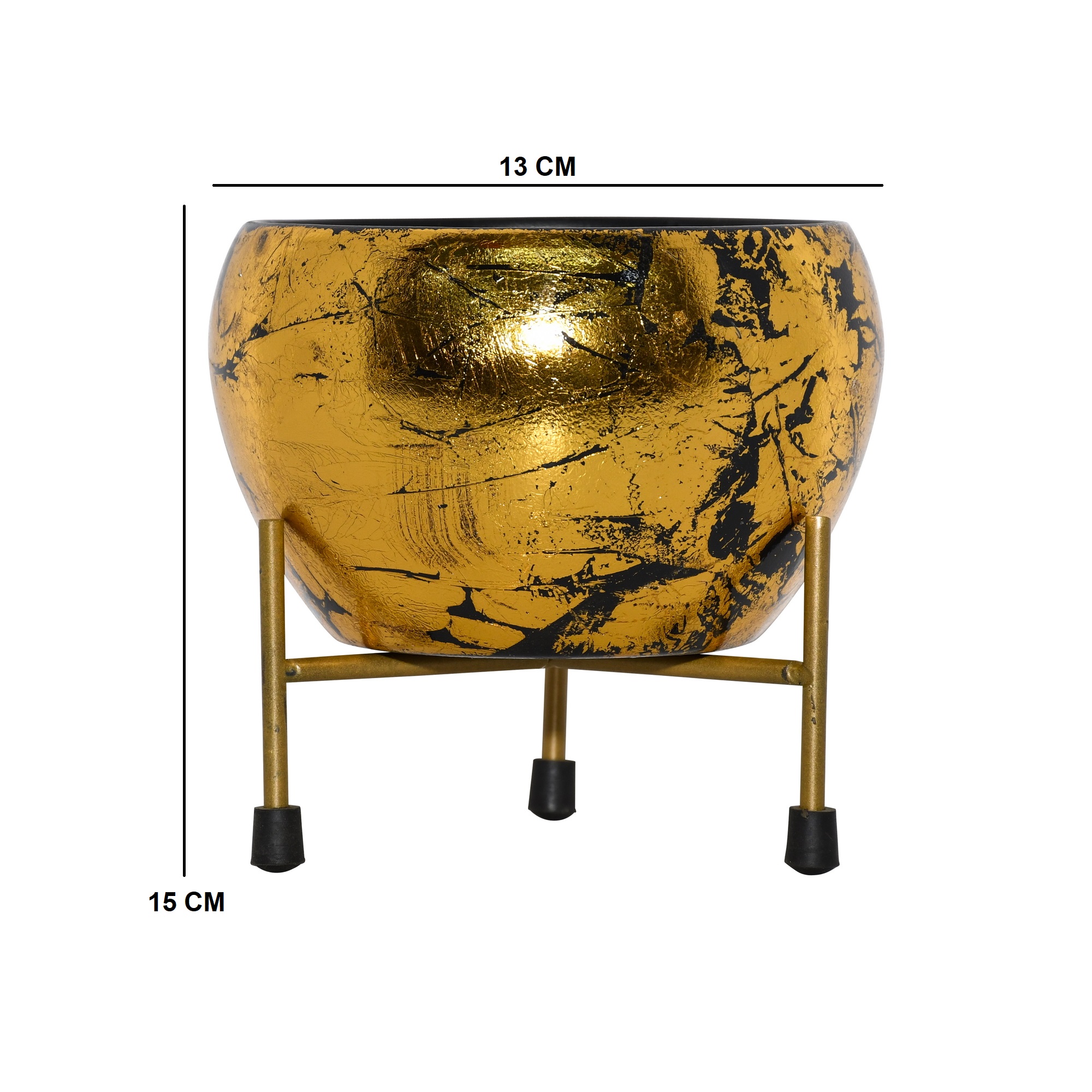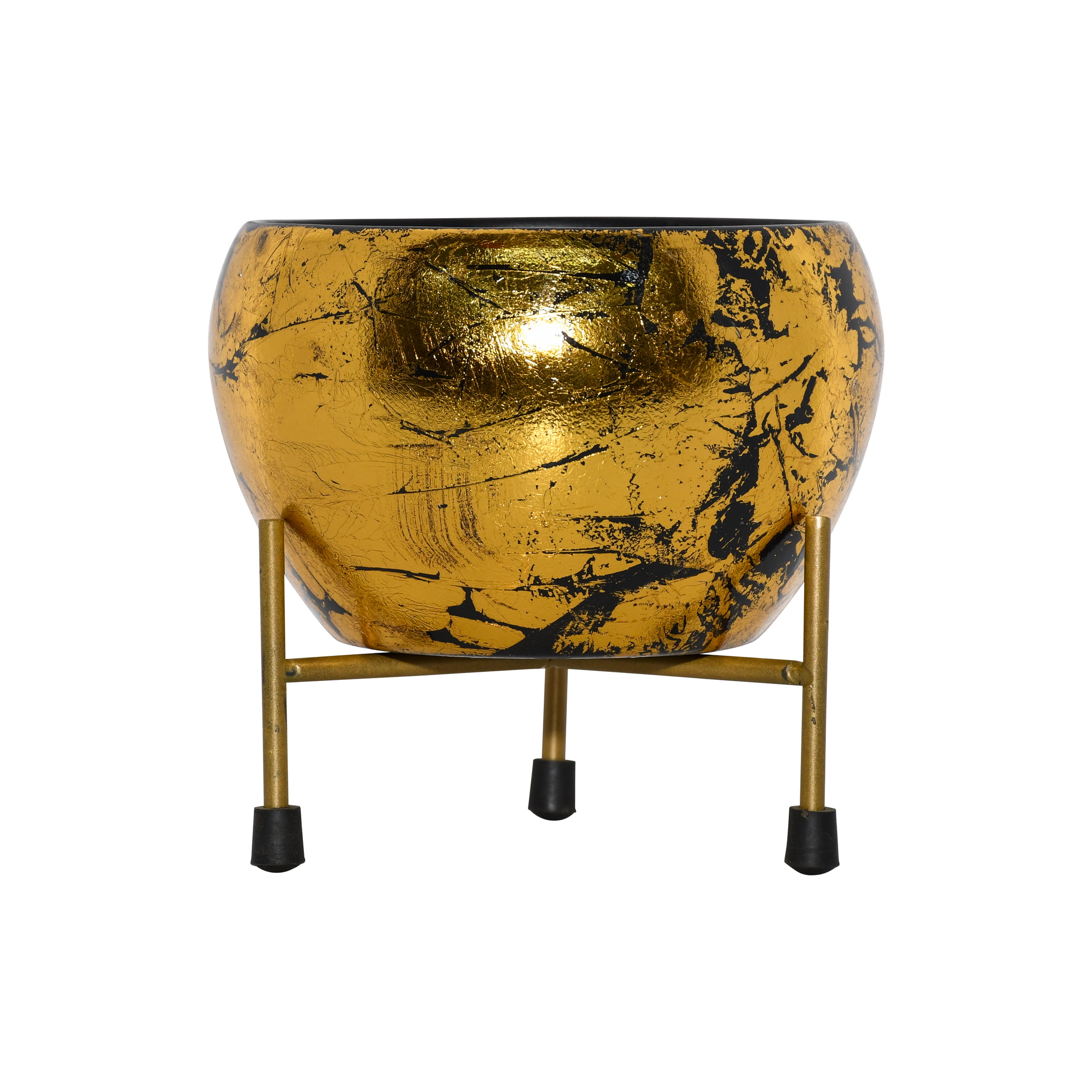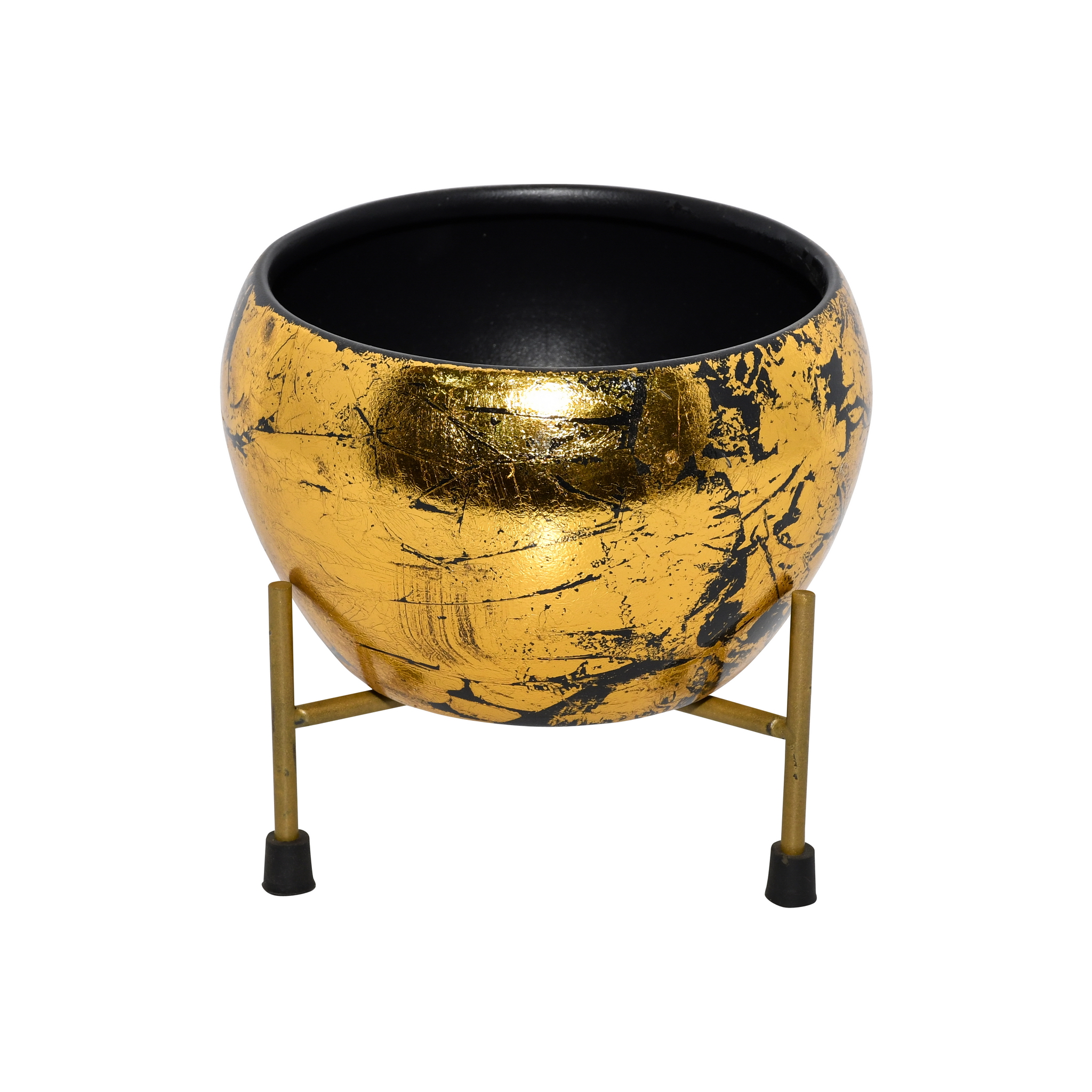 A luxurious and artistic planter set designed to be a show-stopping accent piece. This set features a globular iron pot with a stunning ‘Meena’ finish, supported by a minimalist metal stand. The pot’s surface is artfully decorated with a layer of textured gold foil over a deep black base. This technique creates a rich, distressed effect, allowing the dark background to peek through the lustrous gold for a look of incredible depth and character. The simple, four-legged stand provides a stable and elegant foundation. Perfect for showcasing a plant or as a standalone decorative bowl, this piece brings opulent glamour to any interior.