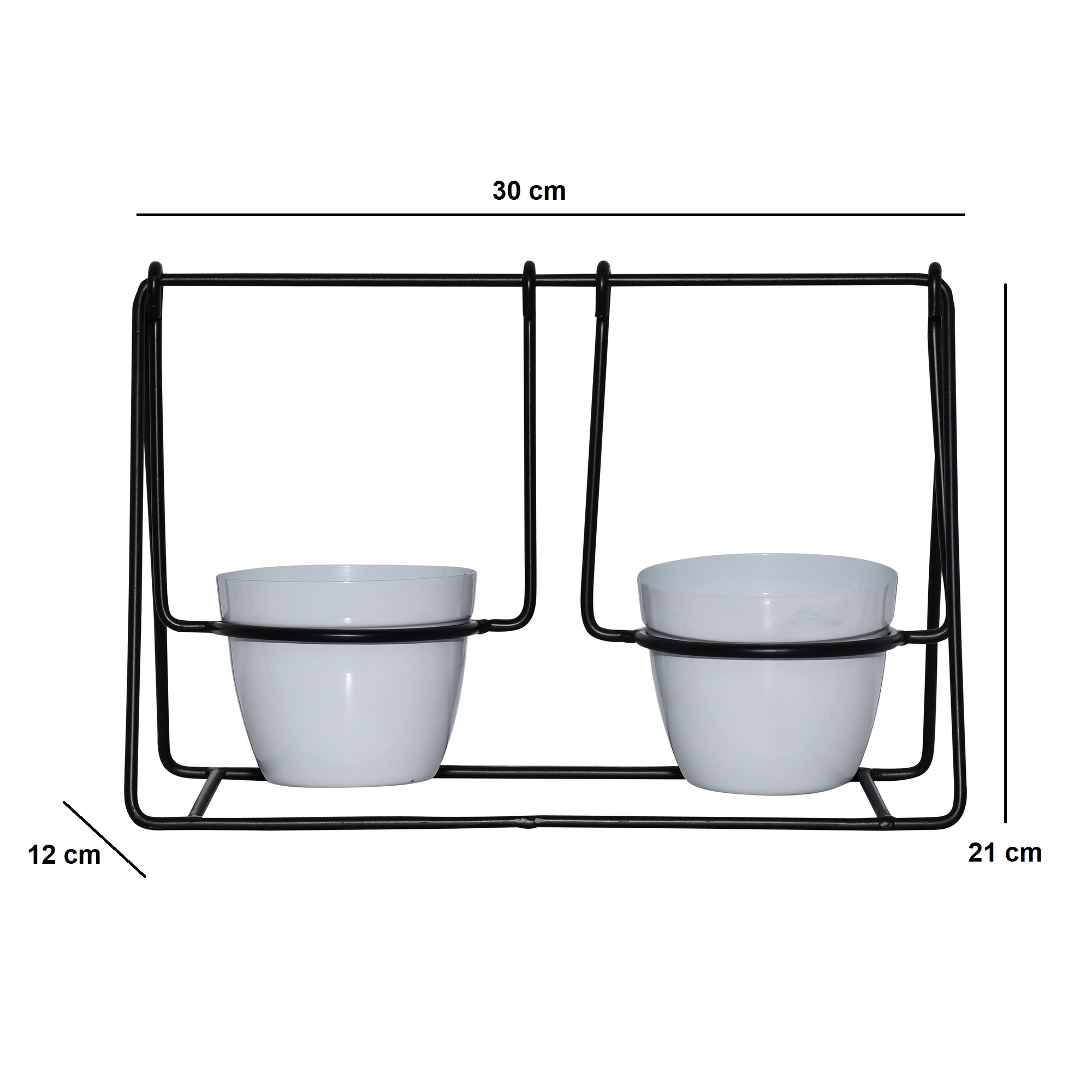 A perfect piece for modern and minimalist decor, this tabletop planter set features two sleek white pots housed in a striking black geometric stand. The stand is crafted from durable metal wire, with an architectural, linear design that provides a bold frame for the two clean, white planter pots. The sharp contrast between the black frame and the white pots creates a chic, contemporary look. Ideal for a desk, windowsill, or kitchen counter, this double planter is perfect for growing a pair of your favorite succulents, herbs, or small houseplants side-by-side.