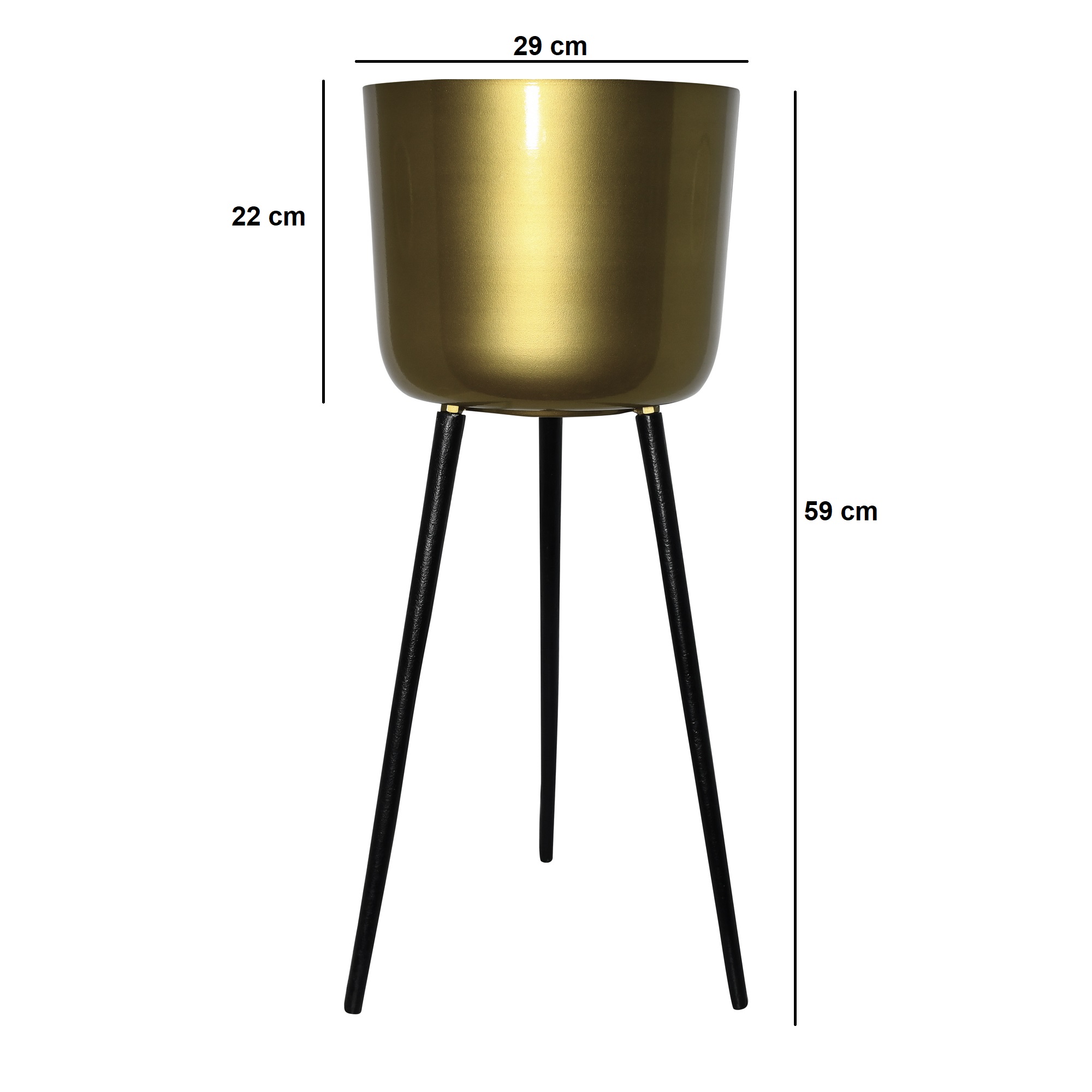 Add a touch of elegance to your interiors with this Modern Gold Metal Decorative Pot featuring sleek black aluminium legs. The pot itself measures 22 cm in height with a diameter of 29 cm, while the total height including the stand is 59 cm. Its stylish gold finish and sturdy tripod design make it perfect for displaying indoor plants, artificial arrangements, or as a standalone décor statement. Ideal for living rooms, offices, balconies, lobbies, and event décor setups.