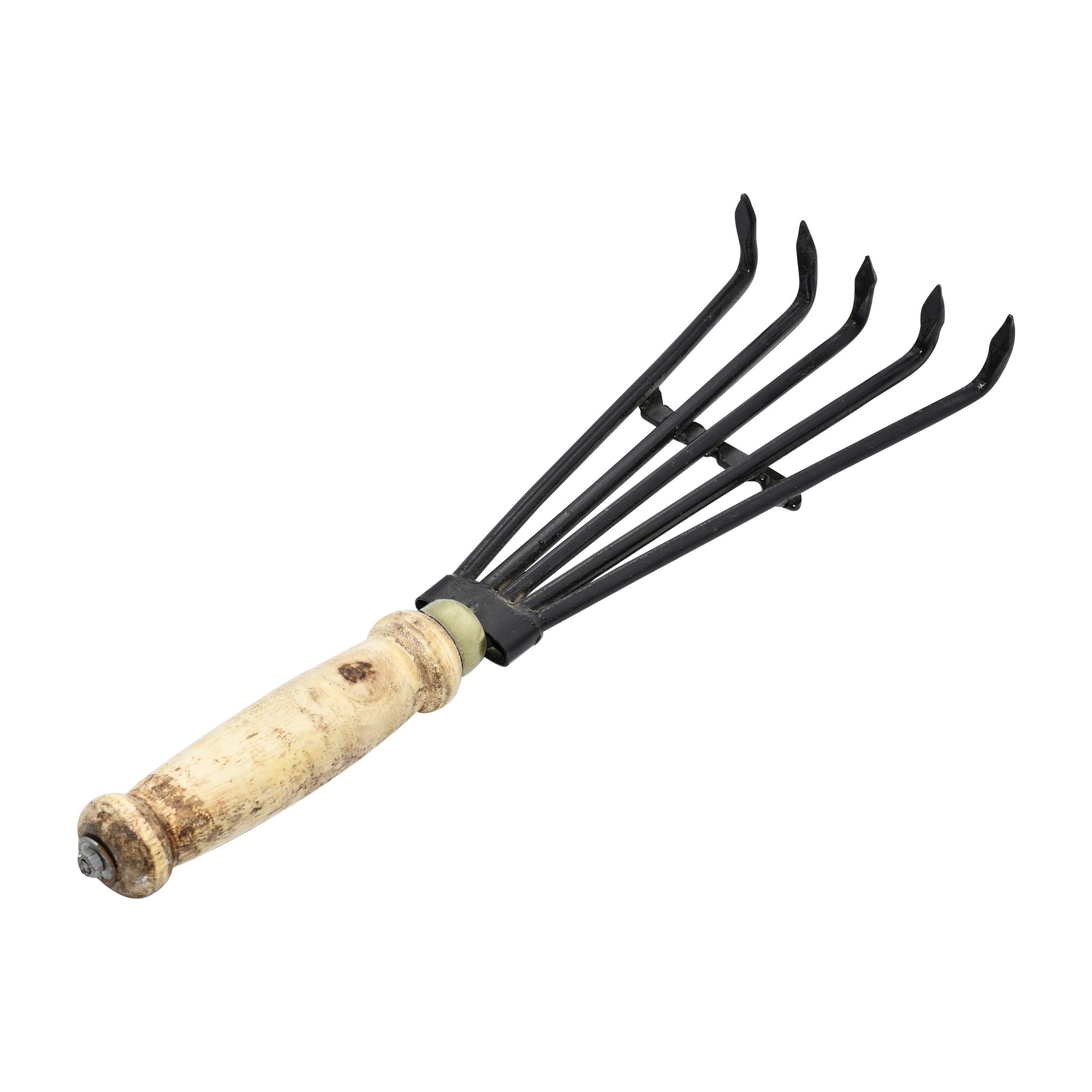 A charming and practical tool that combines rustic style with functional design. This hand rake features a comfortable, contoured handle made from distressed wood, giving it a classic and timeless aesthetic. The head consists of multiple curved metal tines, which are perfect for raking away leaves and loose debris, or for lightly aerating and smoothing soil in garden beds and containers. Its compact size makes it ideal for detailed work and reaching into tight spaces where larger tools cannot go.