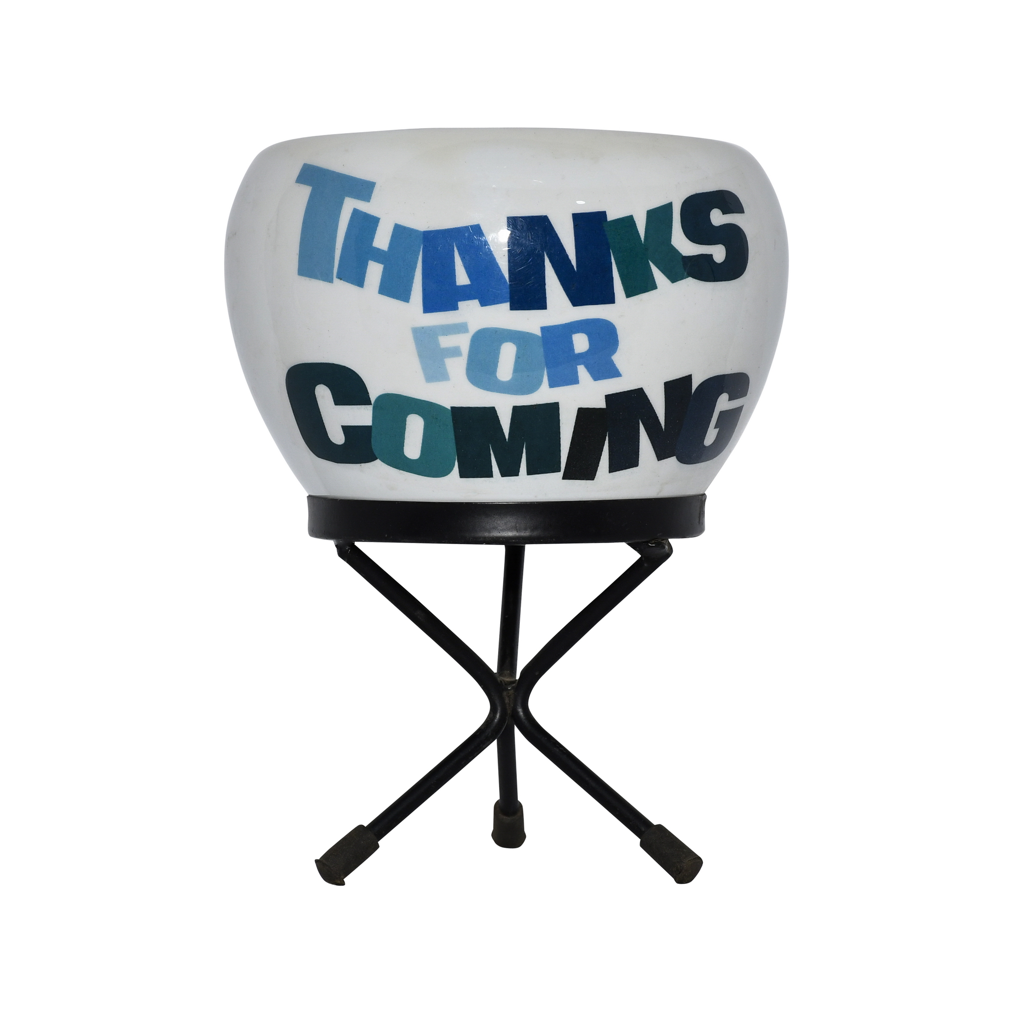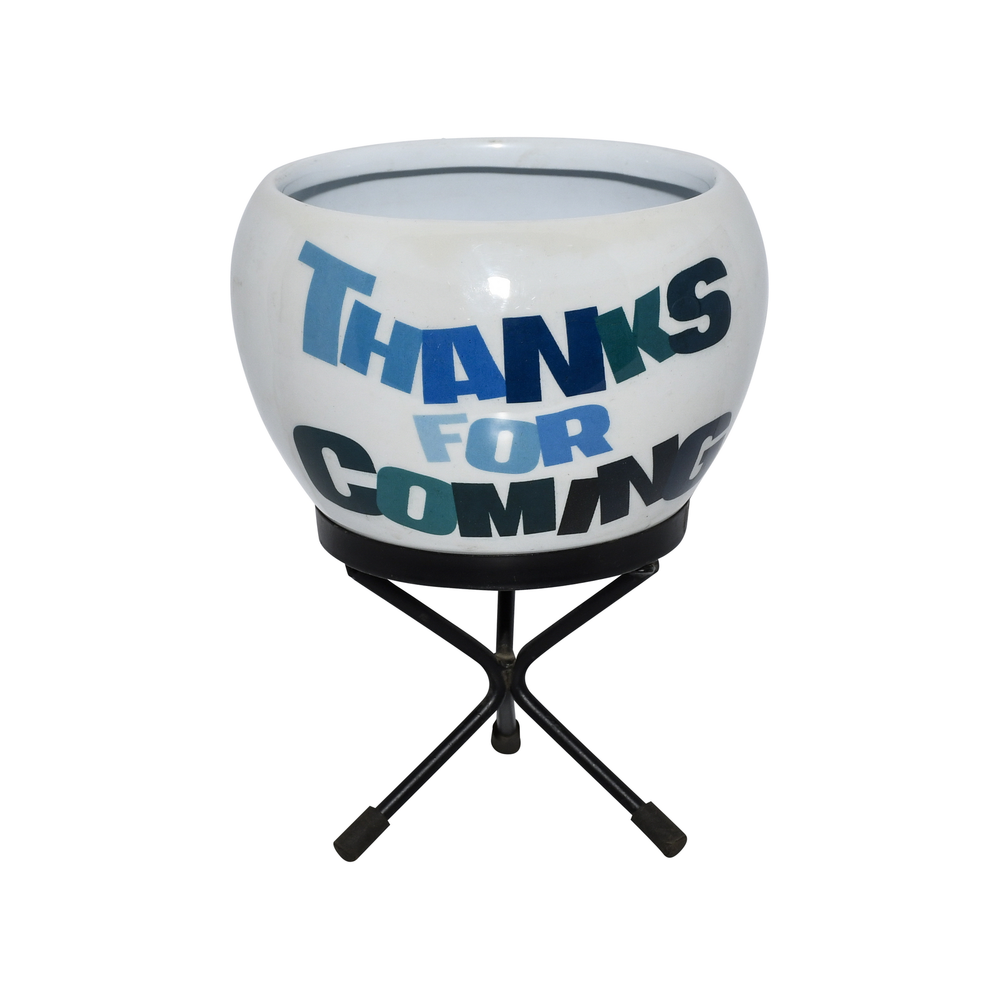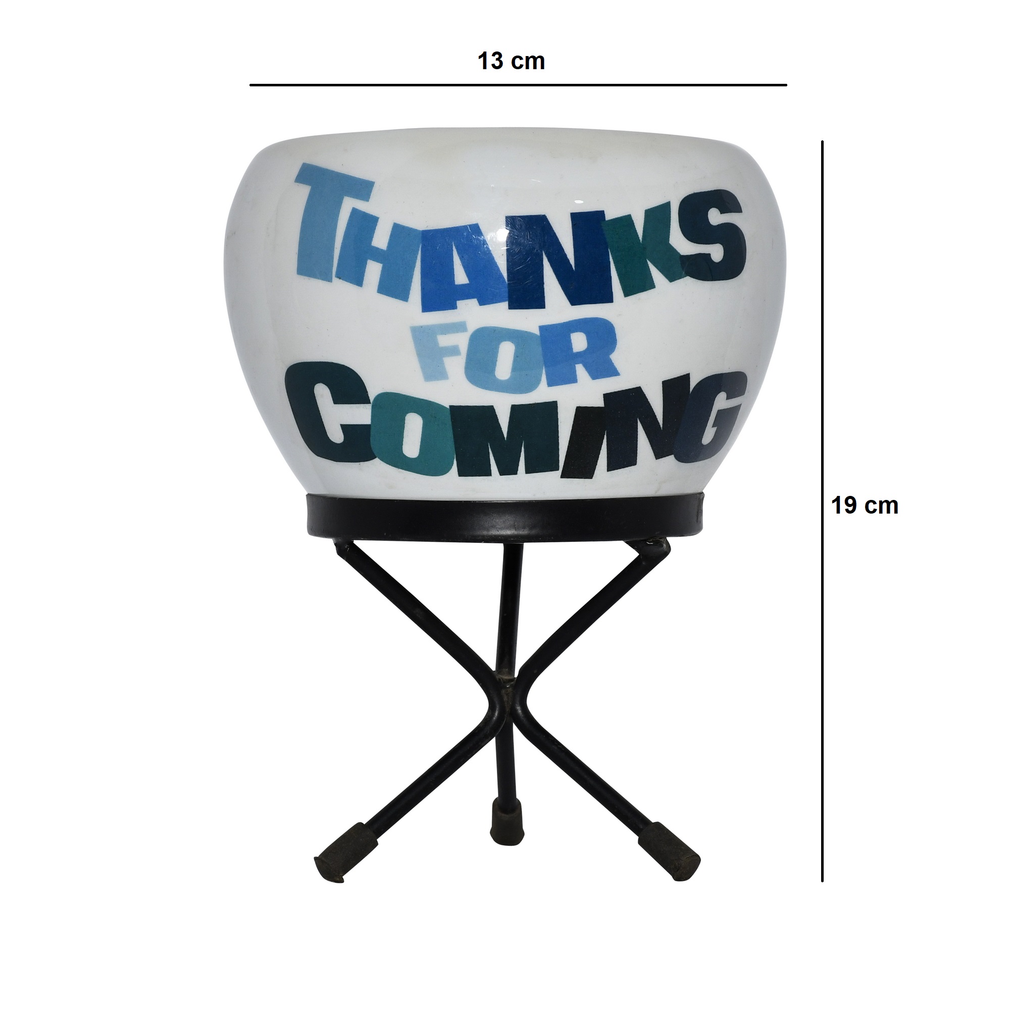The perfect way to show your appreciation, this charming pot and stand set is an ideal party favor or return gift. The set features a rounded metal pot with a glossy white finish, providing a bright canvas for its friendly message. Printed in a stylish, bold font using cool tones of blue and green, the phrase “Thanks for Coming” warmly greets your guests. The pot is supported by a simple and stable black metal stand. Fill it with a small succulent, seeds, or sweet treats to create a memorable and heartfelt token of gratitude for those who celebrated with you.