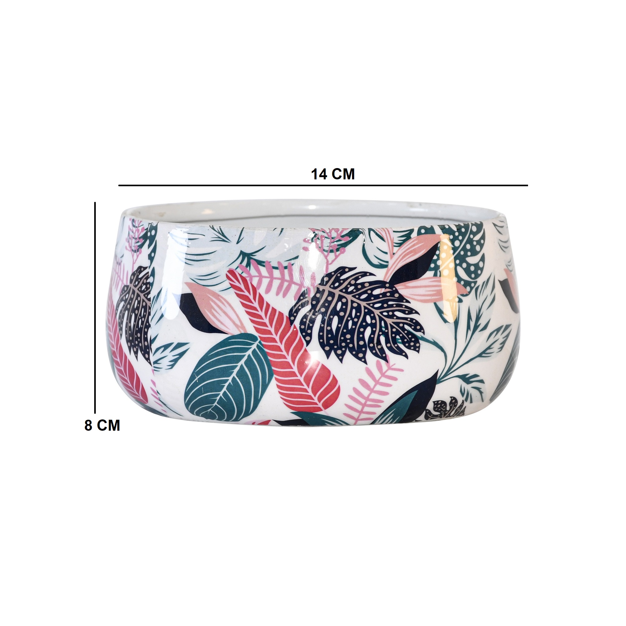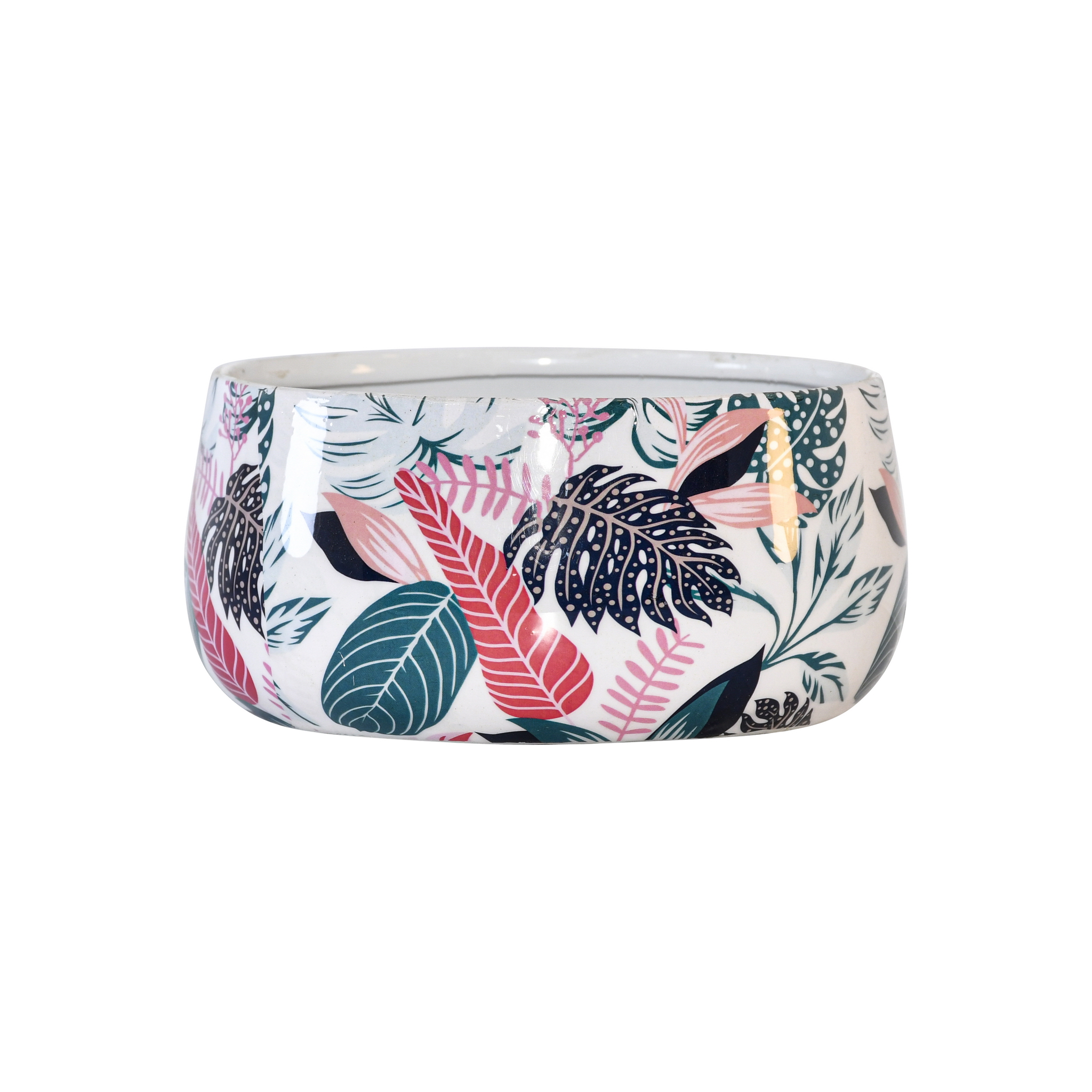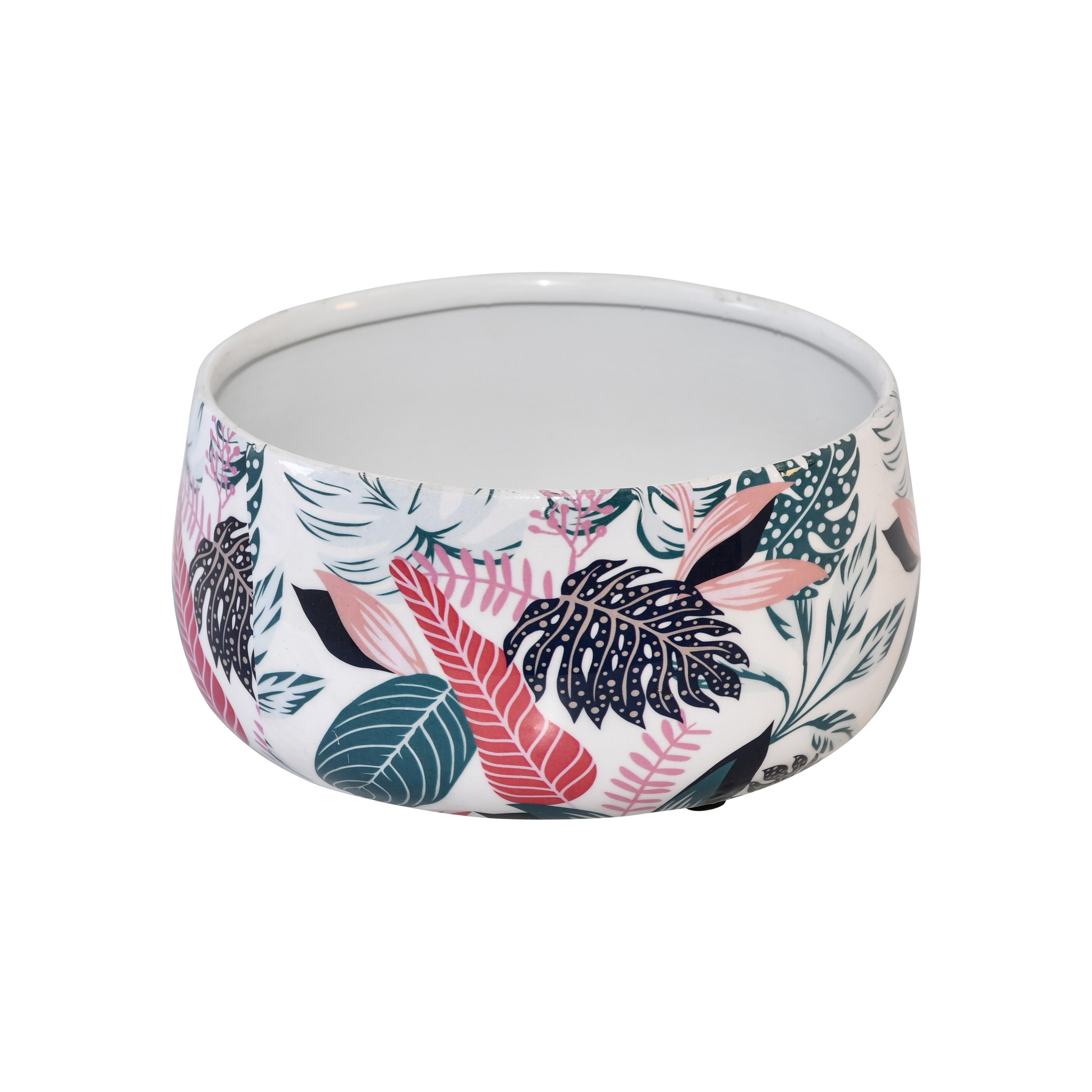 A vibrant and stylish pot that brings a touch of the tropics to any interior. Crafted from durable metal with a high-gloss finish, this planter is designed in a traditional low and wide “matki” or bowl shape. The exterior features a lush, contemporary print of tropical foliage, showcasing stylized leaves like monstera and ferns in a chic color palette of pinks, deep teals, and black against a clean white background. Its versatile, open shape makes it ideal for housing succulents, creating a small indoor herb garden, or serving as a colorful decorative catch-all bowl on a table or shelf.