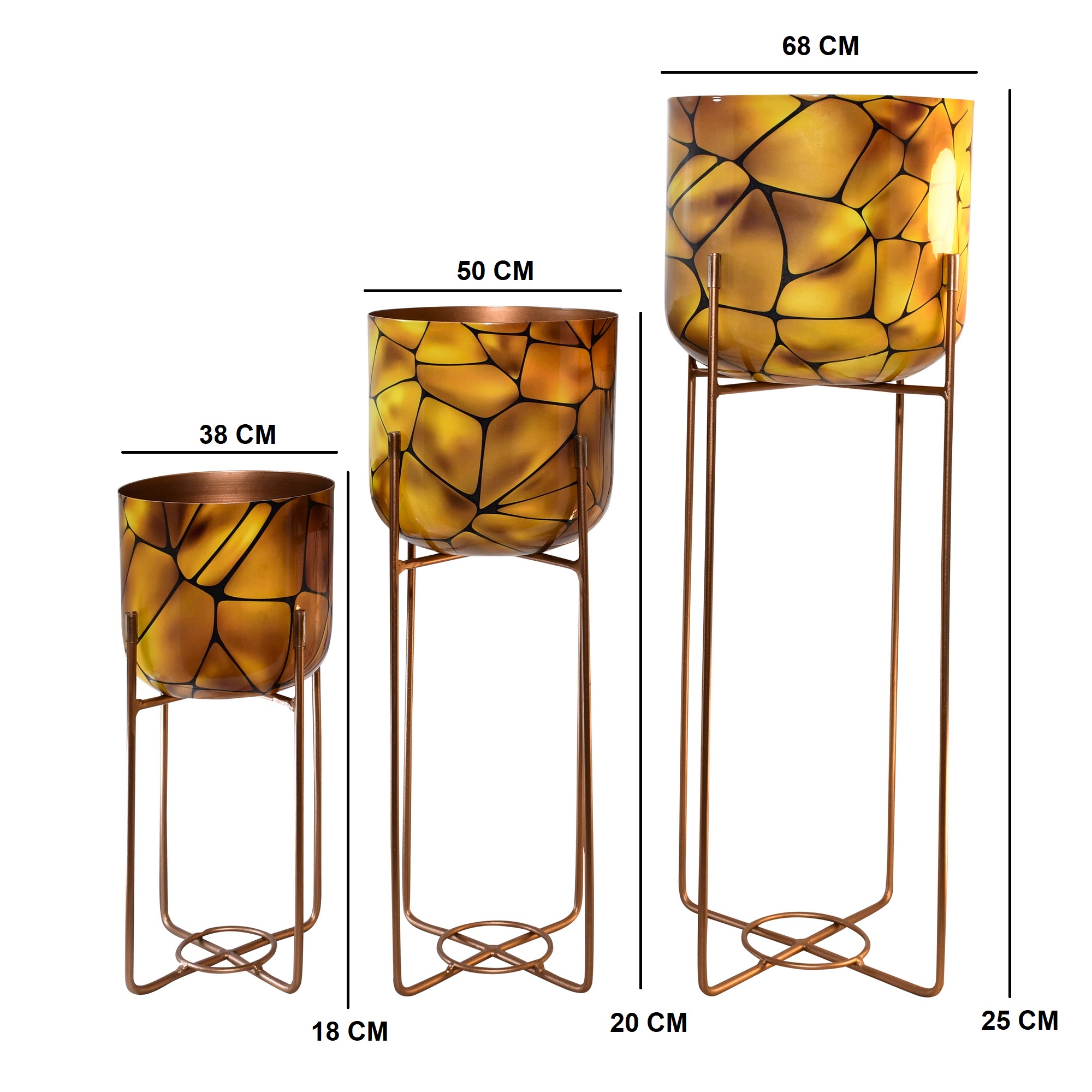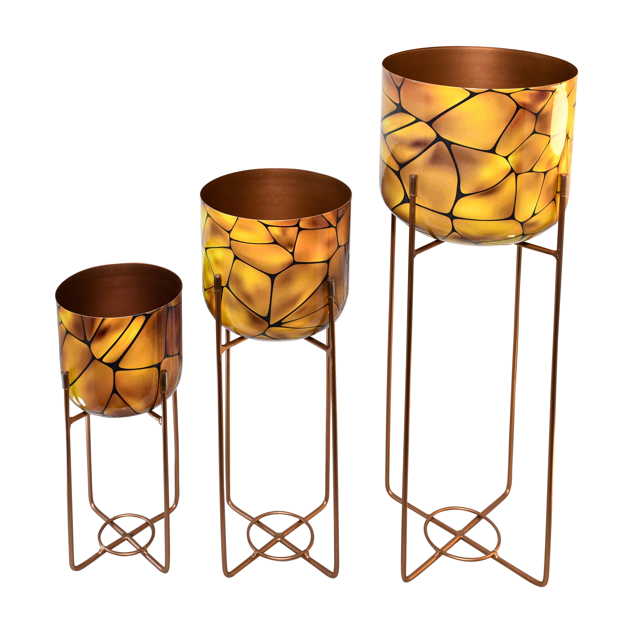 Brighten up your space with this set of three decorative metal planters, featuring a vibrant yellow mosaic print and elegant copper-finished stands. Perfect for displaying indoor plants, these stylish pots add warmth and modern flair to any room.